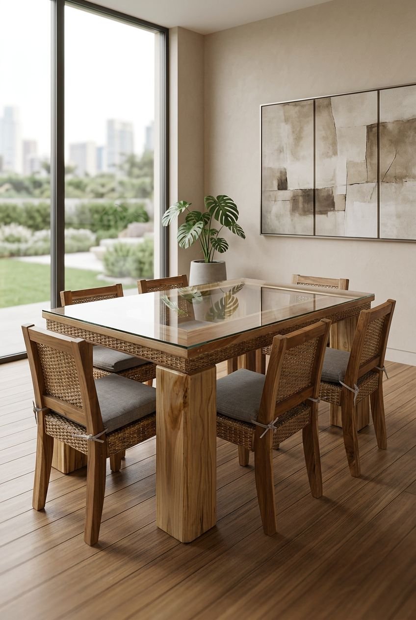 El contraste entre la madera, la fibra y el vidrio convierte este comedor en una pieza versátil, ideal para espacios que buscan elegancia sin perder funcionalidad.