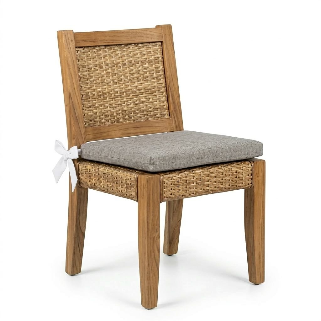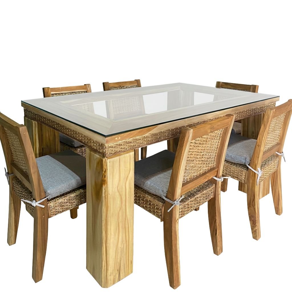 Las sillas, con estructura en madera y tejido en fibra natural, aportan calidez y una textura artesanal que enriquece el conjunto. Su diseño ergonómico y su cojinería de alta densidad garantizan comodidad en cada uso.