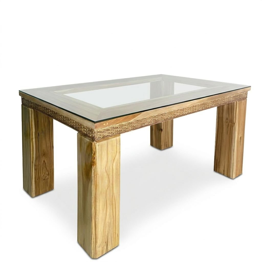 El Comedor Odiseo destaca por su mesa en madera maciza con base estructural sólida, complementada con una cubierta en vidrio templado que aporta elegancia, protección y facilidad de limpieza. Esta combinación de materiales crea un equilibrio perfecto entre lo natural y lo contemporáneo.
