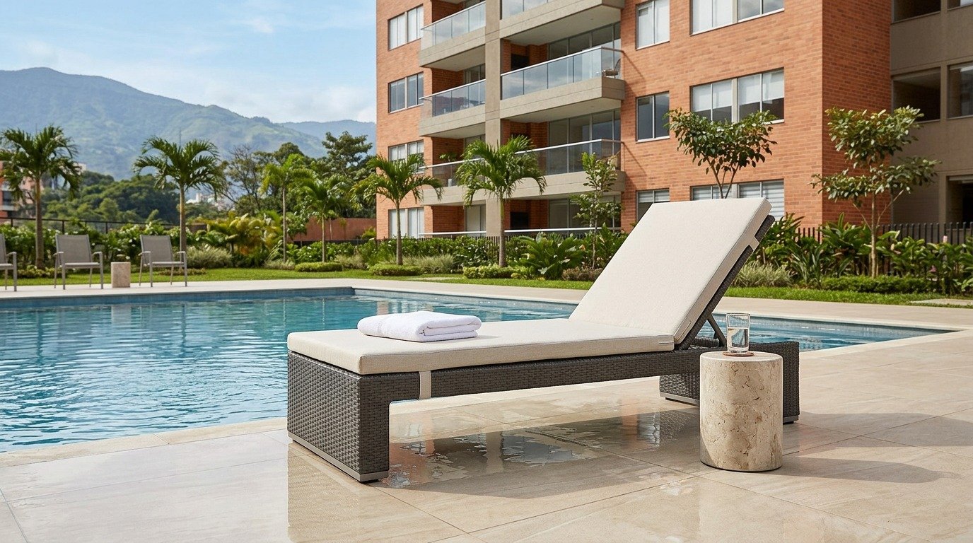 El contraste entre la base oscura y la cojinería clara genera una estética premium, ideal para zonas de piscina, terrazas o rooftops.