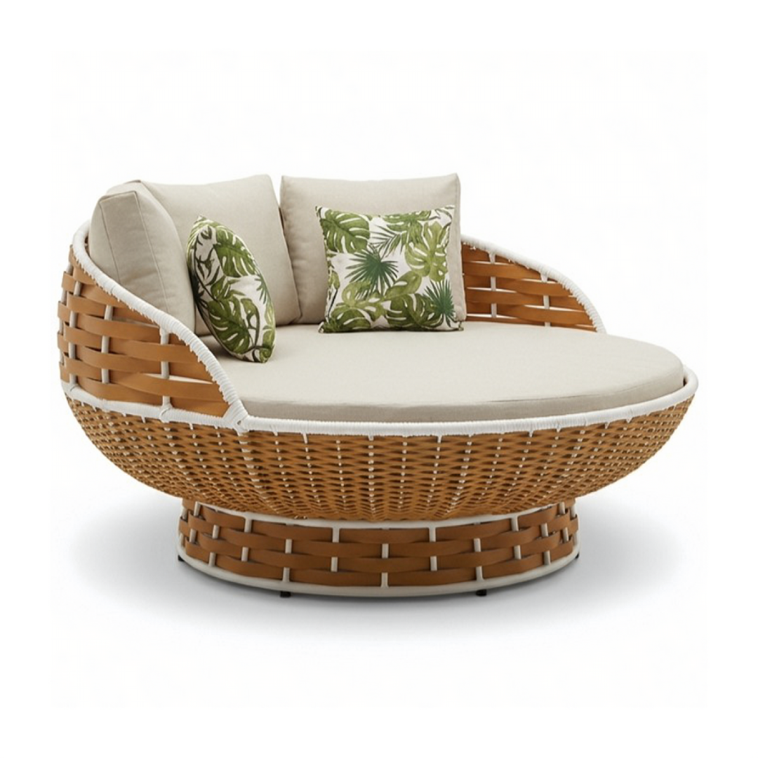 La Cama Torta Asoleadora se destaca por su diseño circular y envolvente, pensado para ofrecer una experiencia de descanso amplia, cómoda y visualmente impactante. Su estructura en fibra tejida aporta textura, calidez y un acabado sofisticado ideal para espacios de lujo.