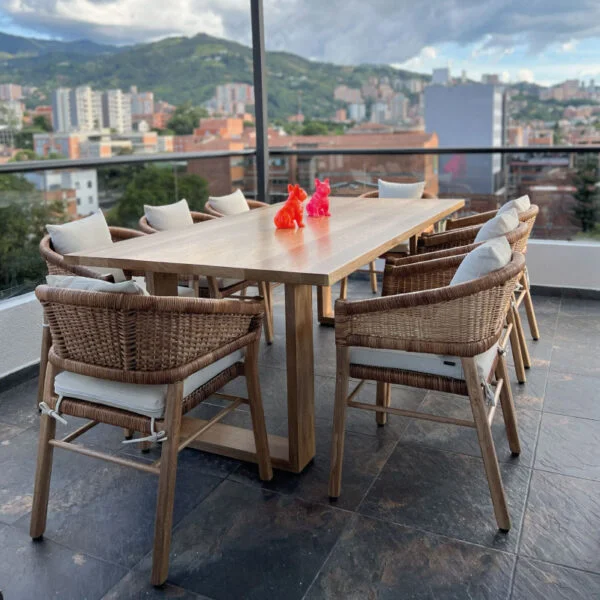 Esta pieza excepcional combina la durabilidad y estabilidad de la madera de roble con la belleza natural del ratán, trabajada mediante técnicas artesanales tradicionales y acabados de primera calidad. Fabricada con materia prima y mano de obra local, asegura un compromiso con la calidad y la Sus materiales están diseñados para resistir el agua, los rayones y el desgaste diario, ofreciendo una funcionalidad superior, además, cuenta con una garantía de 5 años que respalda su excelencia y resistencia.