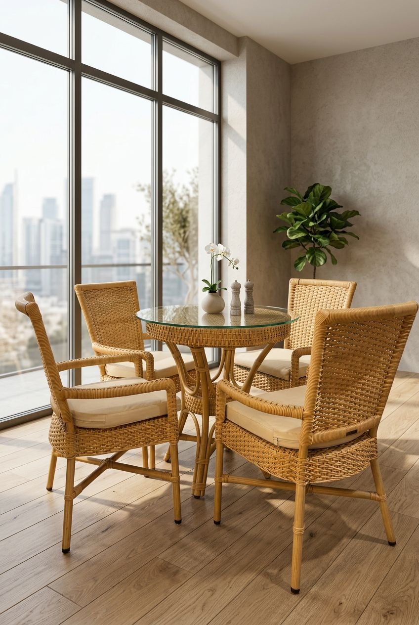 El Comedor Orquijo se caracteriza por su mesa redonda con base central en fibra natural, que aporta ligereza visual y un estilo artesanal auténtico. Su cubierta en vidrio templado añade un toque elegante y funcional, facilitando la limpieza y protegiendo la superficie.