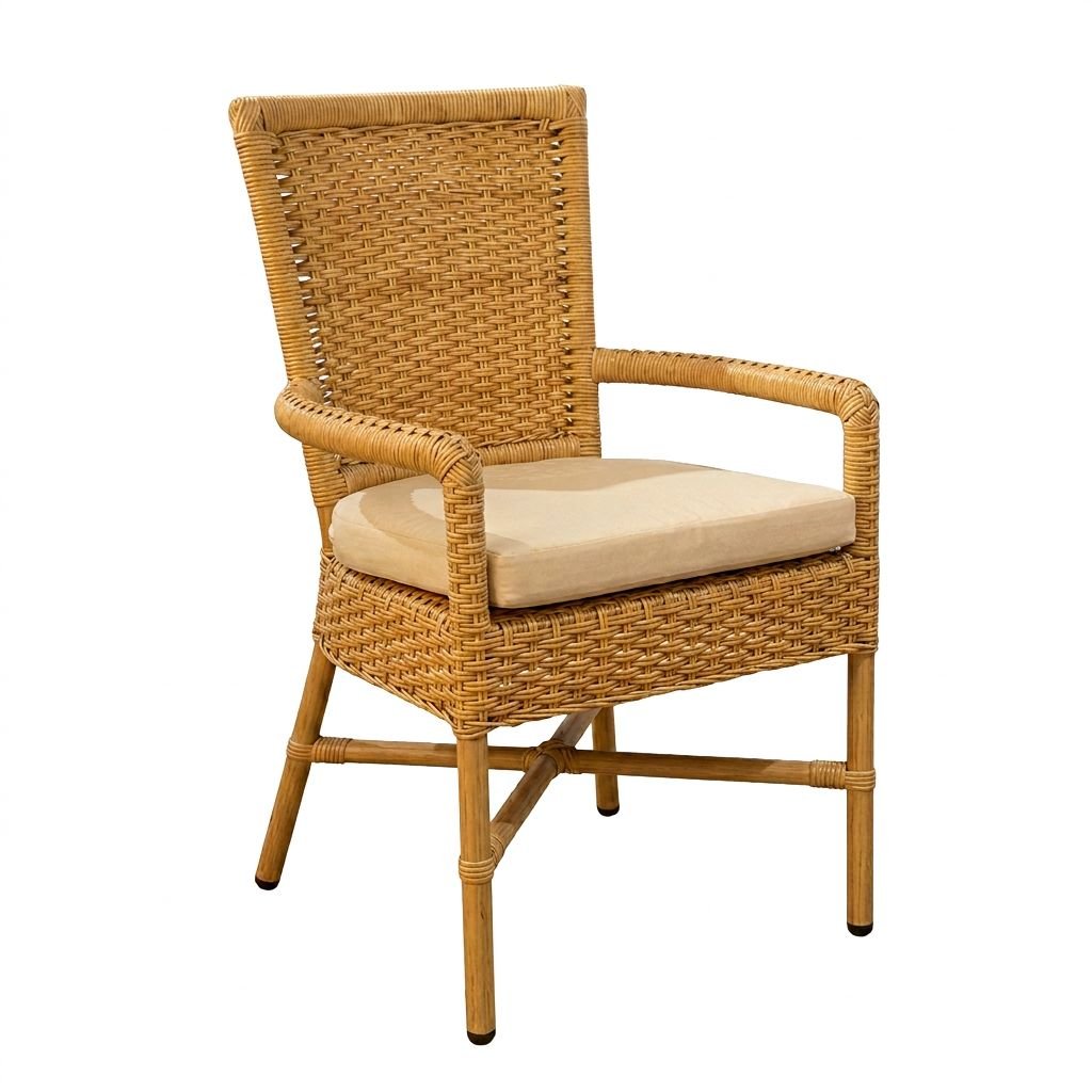Las sillas, elaboradas con estructura resistente y tejido en fibra natural, destacan por su diseño envolvente y su respaldo alto, brindando confort y soporte. Los apoyabrazos y la cojinería de alta densidad aportan una experiencia cómoda, ideal para compartir momentos prolongados.