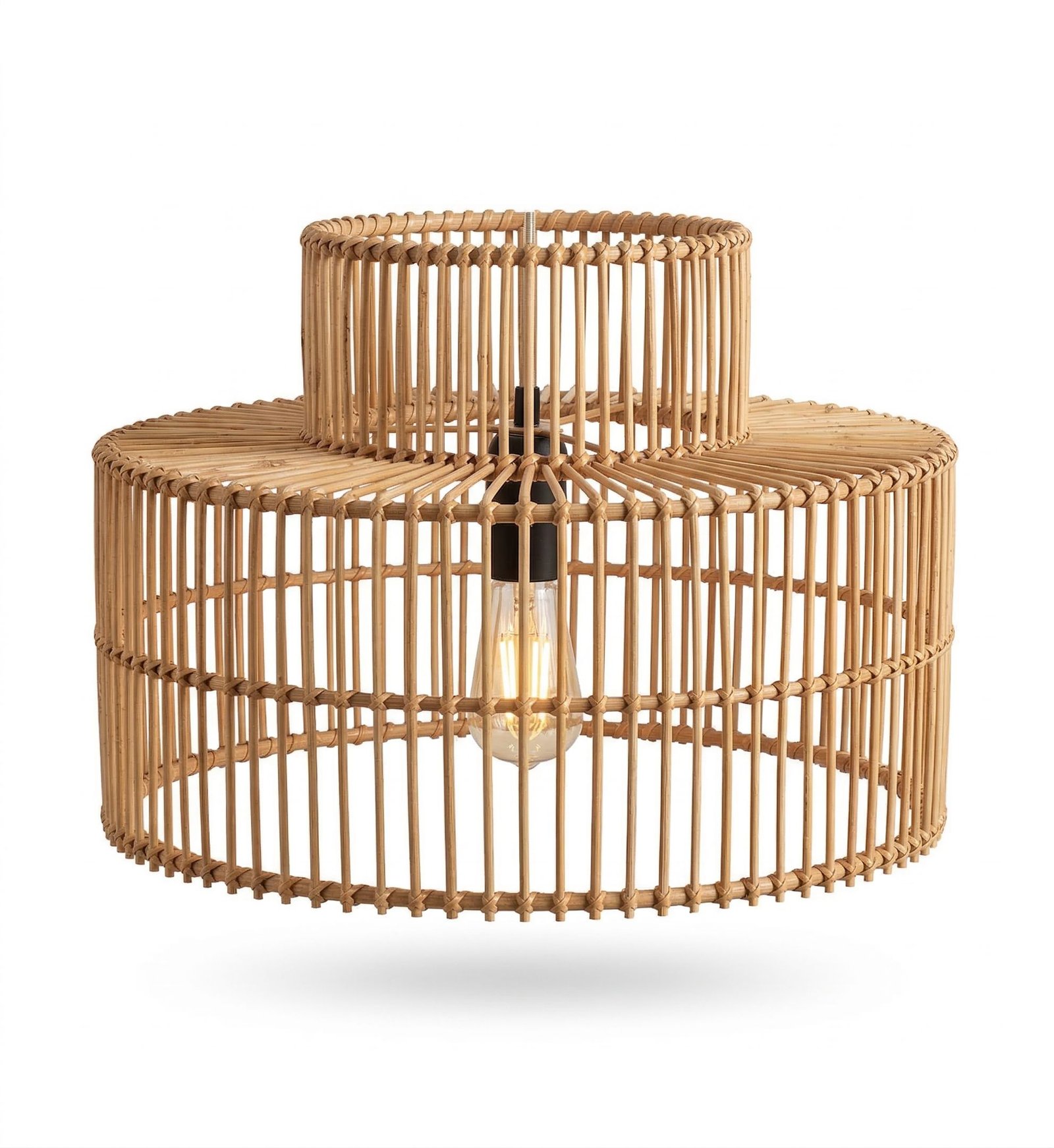 La Lámpara Lira se distingue por su diseño estructural en niveles, donde la fibra natural tejida a mano crea una composición moderna y equilibrada. Su forma horizontal y abierta permite una difusión uniforme de la luz, generando un ambiente cálido y sofisticado.