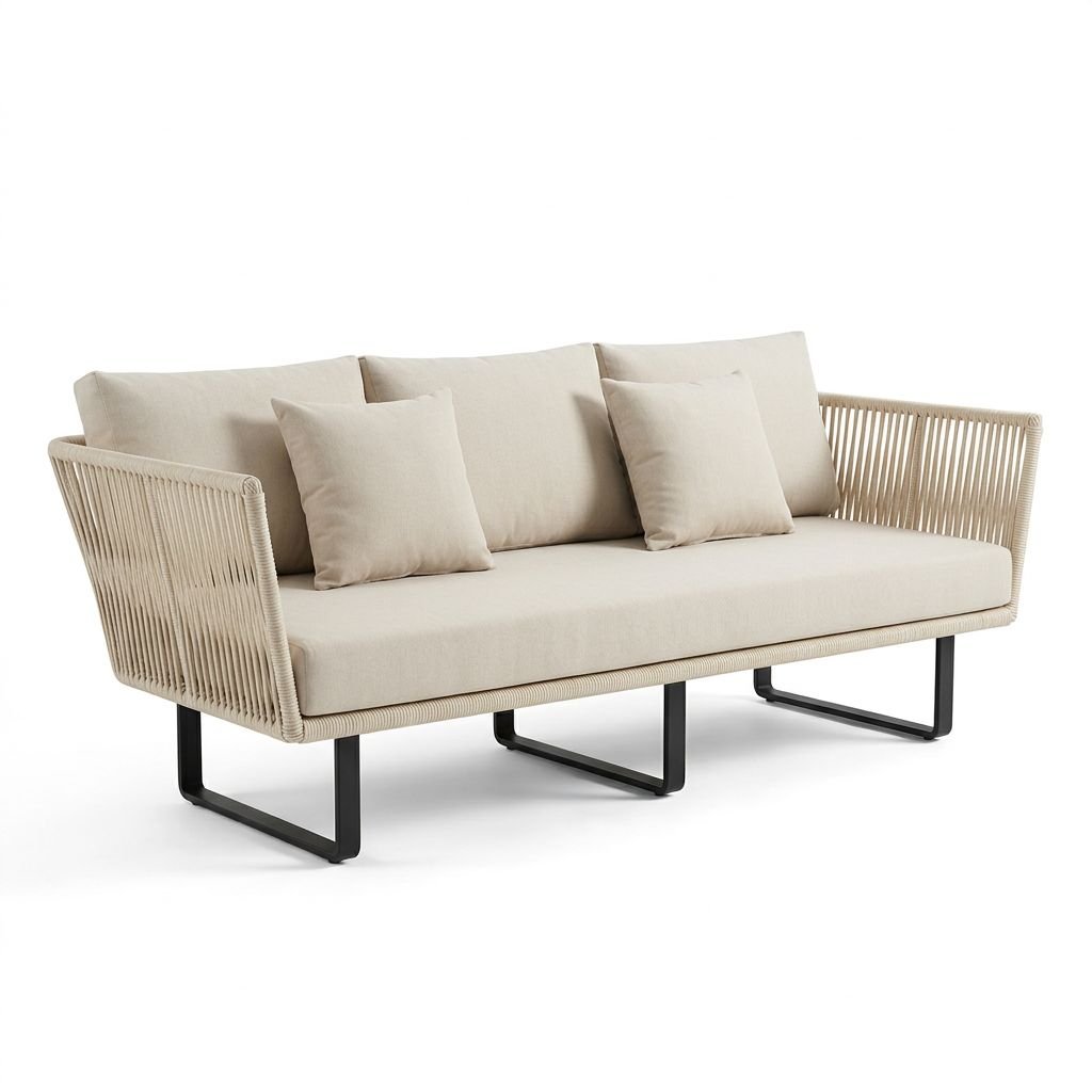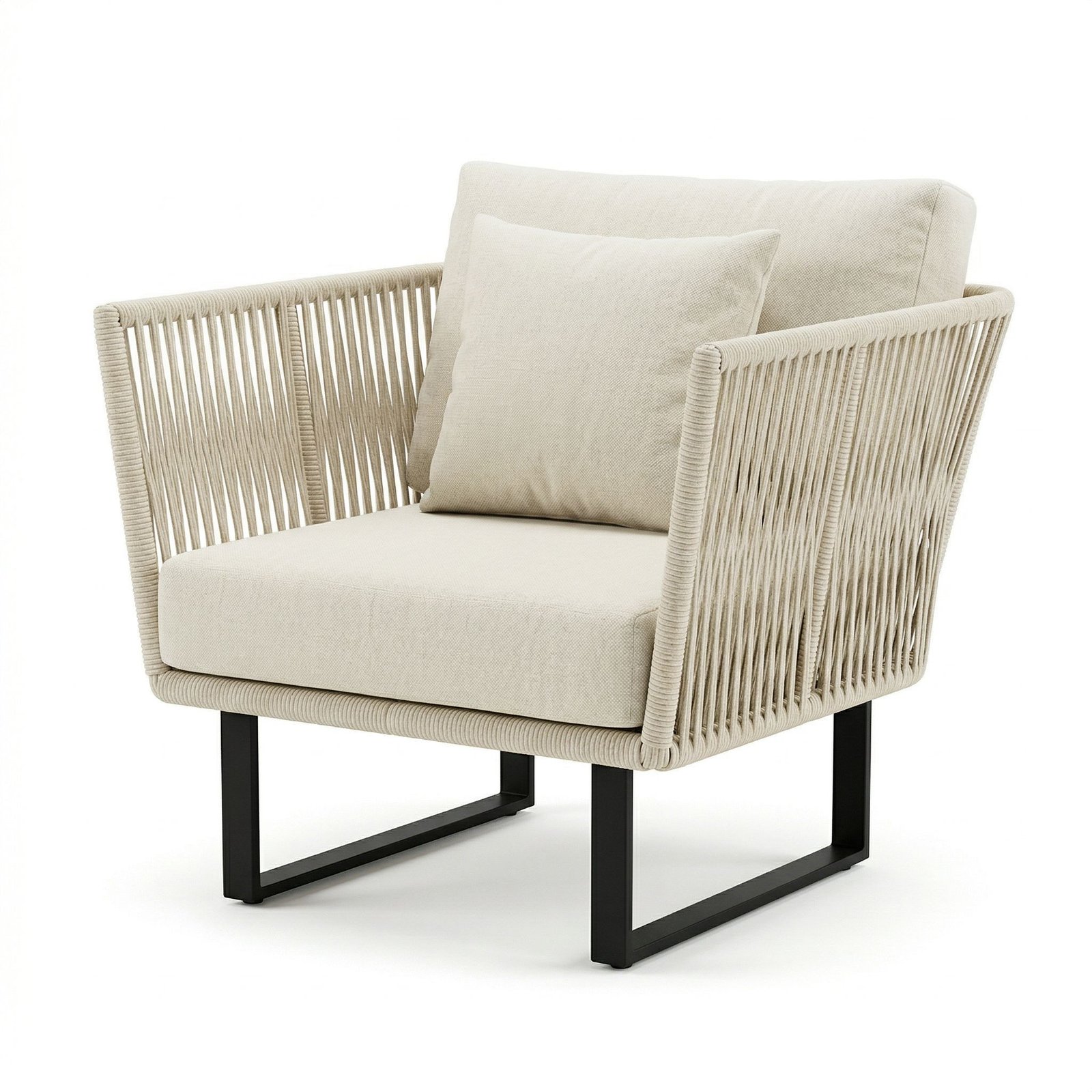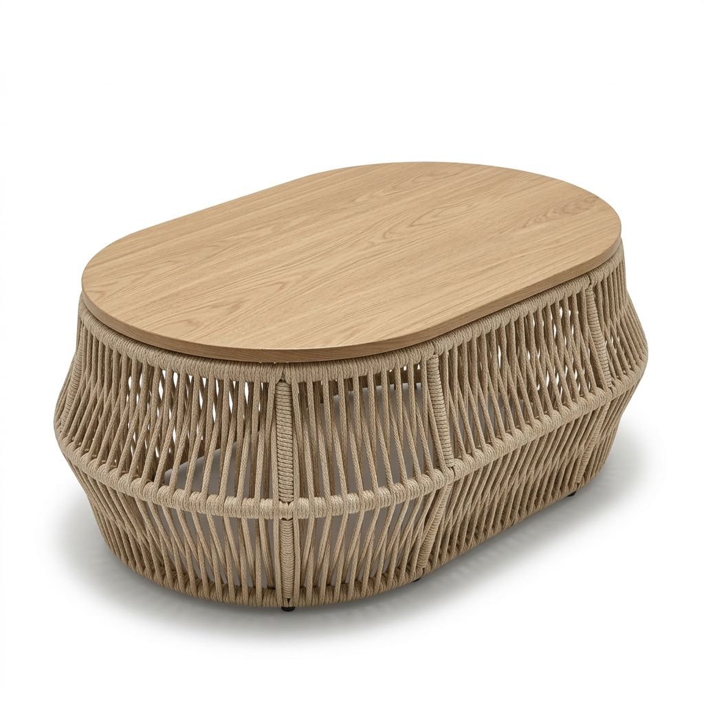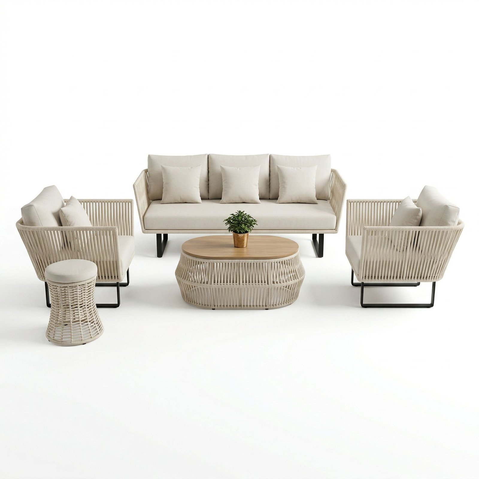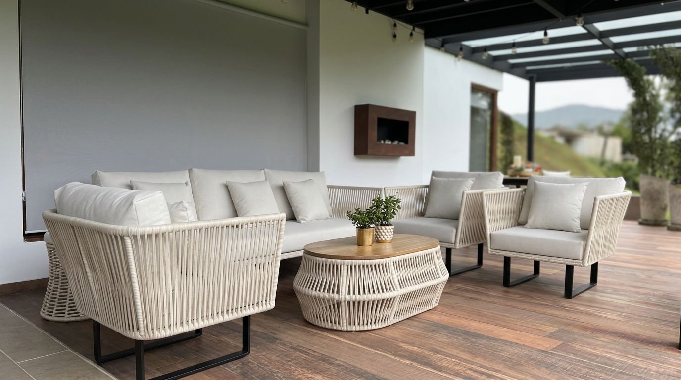 El sofá y las poltronas ofrecen una experiencia de descanso cómoda y envolvente gracias a su diseño ergonómico y su cojinería de alta densidad en telas de alto desempeño. La mesa de centro, con su forma orgánica y superficie en madera, aporta calidez y equilibrio al conjunto.