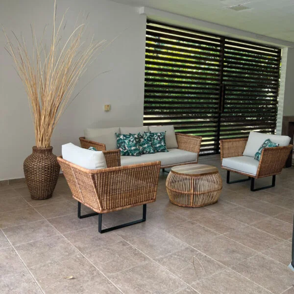 La Sala Ferrara fusiona modernidad y artesanía con un diseño que destaca por su estilo liviano y sofisticado. Su estructura robusta en hierro tratado con pintura electrostática ofrece resistencia y durabilidad para espacios interiores y exteriores cubiertos. El detalle distintivo está en su tejido a mano con rattan sintético alemán, que aporta textura, elegancia y un acabado impecable. El contraste entre sus líneas rectas y cojines suaves crea una atmósfera fresca y contemporánea, ideal para quienes buscan un mobiliario vanguardista sin perder la esencia artesanal.