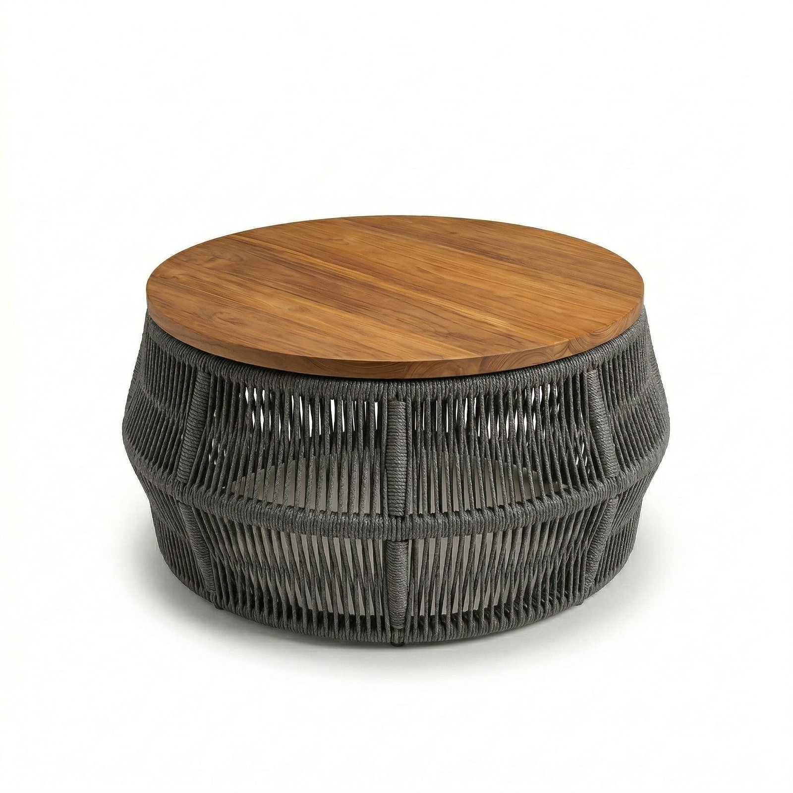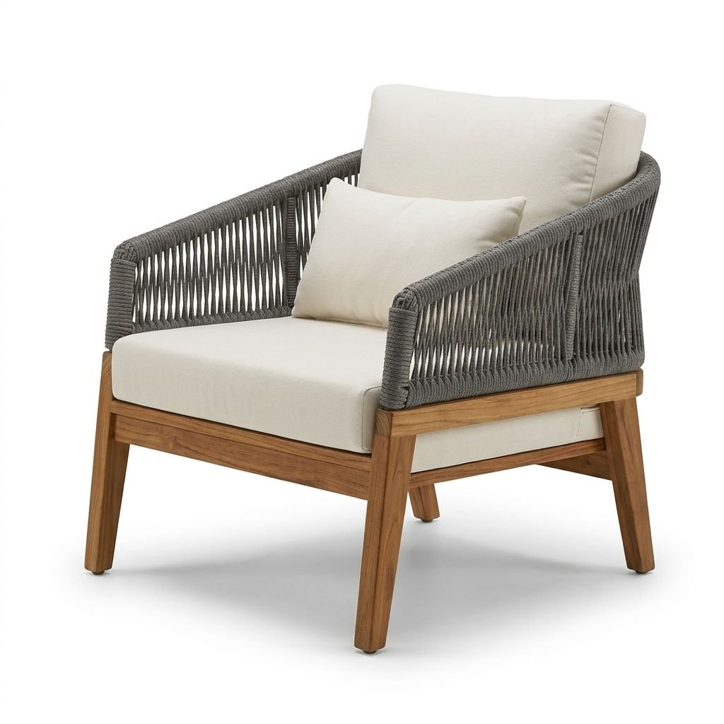La estructura en madera maciza aporta firmeza y estabilidad, mientras que el tejido en cordón sintético de alta resistencia brinda una estética moderna, uniforme y de fácil mantenimiento, ideal para exteriores.